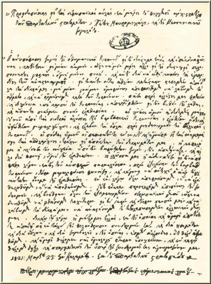 Η παρακάτω επιστολή εστάλη την 23 Μαρτίου 1821 από τον αρχιστράτηγο των Σπαρτιατικών στρατευμάτων Πέτρο Μαυρομιχάλη και την Μεσσηνιακή Σύγκλητο με θέμα «Προειδοποίηση εις τας Ευρωπαϊκάς Αυλάς«.