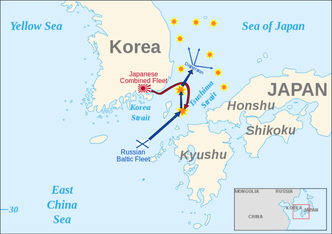 Το σύνολο του Ρωσικού στόλου ήταν πλέον συγκεντρωμένο υπό την διοίκηση του ναυάρχου Rozhestvensky, ο οποίος χωρίς καθυστέρηση κατευθύνεται προς την Ιαπωνία μέσω της θάλασσας της Κίνας. Στις 14 Μαΐου ο Ρωσικός στόλος πλησιάζει την Κορέα κατευθυνόμενος προς τον Ιαπωνικό στόλο ο οποίος τελούσε υπό την διοίκηση του ναυάρχου Togo.