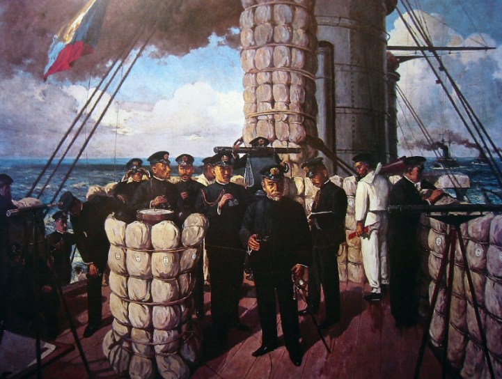 Στις πρώτες φάσεις της μάχης οι Ιάπωνες επικεντρώνουν τα πυρά τους στη Ρωσική ναυαρχίδα Suvorov και το θωρηκτό Oslyabya χτυπώντας με εκρηκτικά βλήματα. Καθώς το Suvorov αδυνατεί να αντιδράσει οι Ιάπωνες βυθίζουν το Oslyabya.