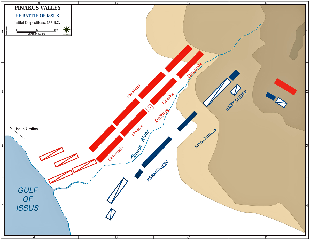 Μόλις ο Δαρείος έμαθε ότι ο Αλέξανδρος πλησιάζει και είναι έτοιμος να δώσει μάχη, πέρασε τριάντα χιλιάδες περίπου ιππείς και είκοσι χιλιάδες περίπου ψιλούς στην απέναντι όχθη του ποταμού Πίναρου, για να παρατάξει με ηρεμία τον υπόλοιπο στρατό του. Τοποθέτησε μπροστά από τους οπλίτες τους τριάντα χιλιάδες περίπου Έλληνες μισθοφόρους, απέναντι από τη μακεδονική φάλαγγα. Δίπλα τους σε κάθε πλευρά, τριάντα χιλιάδες περίπου από τους επονομαζόμενους Κάρδακκες, που ήταν επίσης οπλίτες. Τόσους χωρούσε η περιοχή, αν παρατάσσονταν σε φάλαγγα. Στην αριστερή του πλευρά, κοντά στο βουνό, απέναντι από τη δεξιά πλευρά του Αλέξανδρου, τοποθέτησε γύρω στους είκοσι χιλιάδες. Μερικοί απ’ αυτούς, κινήθηκαν προς τα νώτα της στρατιάς του Αλέξανδρου. Το βουνό στο οποίο παρατάχτηκαν σχημάτιζε σ’ ένα σημείο κοιλότητα, σαν θαλάσσιο κόλπο· έπειτα, σχημάτιζε μία καμπύλη, που έσπρωχνε τους παραταγμένους στους πρόποδες, πίσω από τη δεξιά παράταξη του Αλέξανδρου. Οι υπόλοιποι ψιλοί και οπλίτες παρατάχτηκαν κατά έθνη, πίσω από τους Έλληνες μισθοφόρους και τους παραταγμένους κατά φάλαγγα βαρβάρους, σε τέτοιο βάθος, ώστε να είναι άχρηστοι. Λέγεται ότι όλη η στρατιά του Δαρείου αποτελούνταν από εξακόσιες χιλιάδες μάχιμους άνδρες.