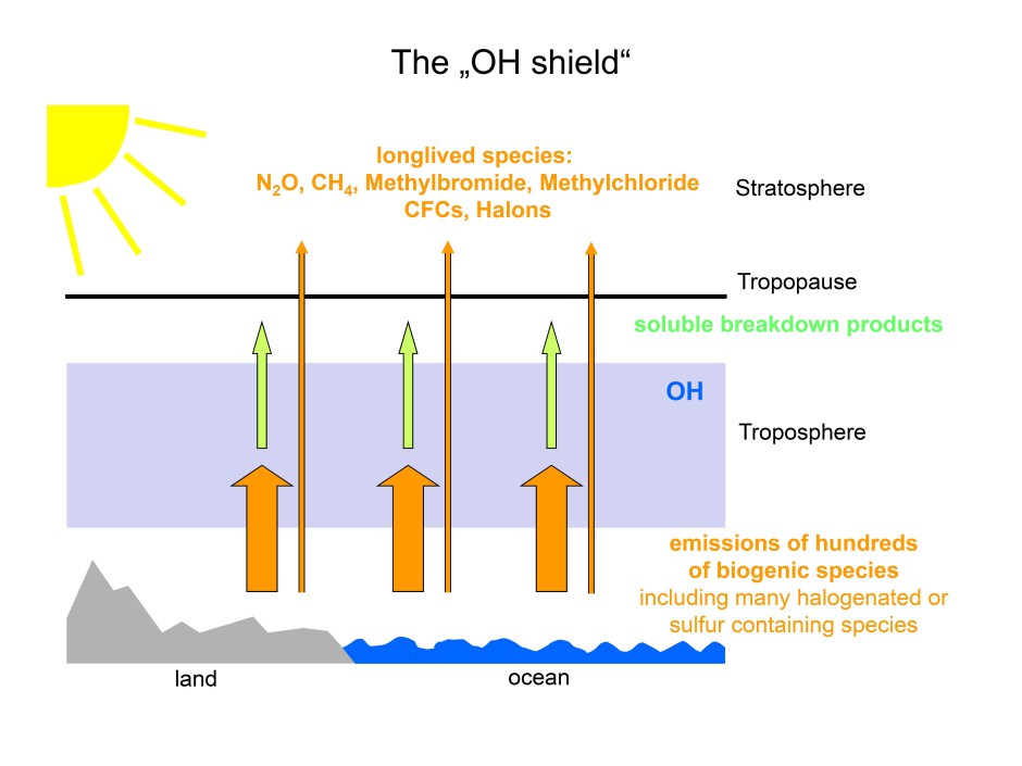 Όπως θα συνέβαινε και με ένα τεράστιο ανελκυστήρα, πολλές χημικές ενώσεις από αυτές που εκπέμπονται στο έδαφος, περνούν αφιλτράριστες μέσα από αυτό το λεγόμενο «απορρυπαντικό στρώμα» της ατμόσφαιρας το οποίο οι επιστήμονες αποκαλούν «OH ασπίδα ¹».