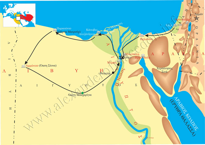 Από τις εκβολές του Νείλου, όπου είχε οριοθετήσει την πόλη του, ο Αλέξανδρος ξεκίνησε με ένα ελαφρύ και ταχυκίνητο απόσπασμα συνοδείας για το μαντείο του Άμμωνα Ρα στην όαση Σίουα, ένα δύσκολο ταξίδι περίπου 530 χλμ ή 2.867 σταδίων, δηλαδή περίπου 15 σταθμών. Κανένας από τους αρχαίους ιστορικούς δεν αναφέρει πόσο στρατό πήρε μαζί του ο Αλέξανδρος, αλλά θα πρέπει να θεωρούμε ως δεδομένο ότι ήταν ελαφροί πεζοί και ιππείς, ίσως υπασπιστές και πρόδρομοι, ενώ για τη μεταφορά των εφοδίων ο Κούρτιος λέει ότι χρησιμοποιήθηκαν καμήλες. Προχώρησε παραλιακά, ώστε να έχει την υποστήριξη του στόλου, διέσχισε την όχι εντελώς άνυδρη έρημο και μετά από 1.600 στάδια (περίπου 295 χλμ) έφτασε στο Παραιτόνιο (Μάρσα Ματρούχ). Εκεί τον συνάντησαν πρέσβεις από τις Ελληνικές πόλεις της Κυρηναϊκής. Του παρέδωσαν ένα στεφάνι, 300 ἵππους πολεμιστάς, 5 εξαιρετικά τέθριππα (ίσως ένα από κάθε μέλος της Πεντάπολης) πολλά άλλα μεγαλοπρεπή δώρα και συνήψαν μαζί του σύμφωνο φιλίας και συμμαχίας.
