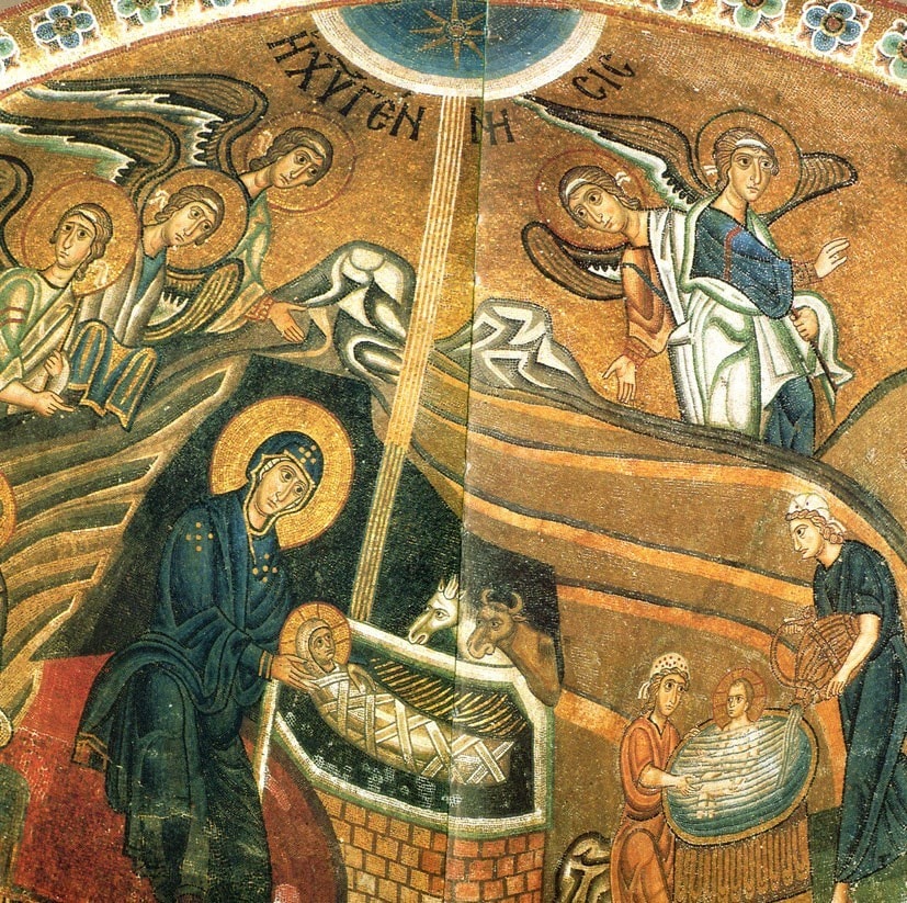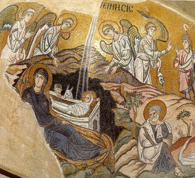 Γύρω στὸν 11ο αἰ. βρίσκουμε στὰ μεγάλα μνημειακὰ σύνολα τῶν ψηφιδωτῶν παραστάσεις τῆς Γεννήσεως ποὺ συγκεντρώνουν ὅλα τὰ ἐπιμέρους εἰκονογραφικὰ στοιχεῖα. Τὰ ψηφιδωτὰ τοῦ Καθολικοῦ τῆς Μονῆς τοῦ ῾Οσίου Λουκᾶ (ἀρχὲς 11ου αἰ.) καὶ τοῦ Καθολικοῦ τῆς Μονῆς Δαφνίου (τέλος 11ου αἰ.) εἶναι δύο χαρακτηριστικὰ καὶ προσιτὰ δείγματα, ποὺ μποροῦν νὰ μᾶς δώσουν τὴν αὐθεντικὴ εἰκονο- γραφικὴ σύνθεση.