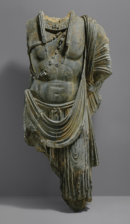 Για παράδειγμα μια ομάδα γλυπτών που ανασύρθηκε από ανασκαφές στο ναό της Χάντα γνωστά ως Tapa-i-Shotor, αναπαριστούν έναν Βούδα που πλαισιώνεται από τέλεια αναπαριστάμενη Ελληνιστική μορφή της Τύχης, η οποία κρατά το κέρας της Αμάλθειας της και ο Ηρακλής δεν κρατά το σύνηθες ρόπαλο, αλλά τον κεραυνό που σχετίζεται με τον χαρακτήρα της Boddhisatva Βατζραπάνι .