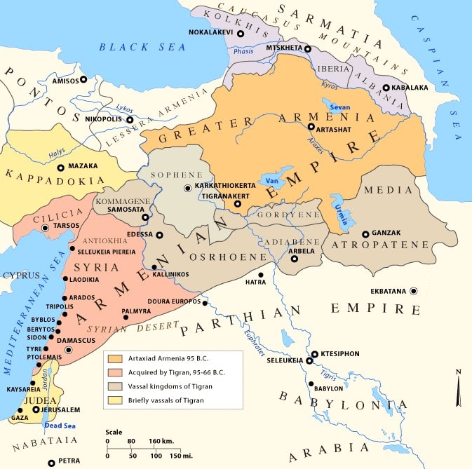 Αρμενία, το πλούσιο ορεινό βασίλειο ανατολικά της Ανατολίας, που από τη μία ο νησιωτικός χαρακτήρας και από την άλλη η γεωμορφολογία της, με τα υψίπεδα και τις οροσειρές να ορθώνονται από 400 ως και πάνω από 4000 μέτρα, συνέτειναν στην απομόνωσή της από τις όμορες χώρες. Τραχύ έδαφος, ορεινά περάσματα και φυλασσόμενες είσοδοι σε κάθε κατεύθυνση. Περί το έτος 190 π.Χ. ο Αρταξίας, ιδρυτής της δυναστείας των Αρταξιδών και βασιλέας της Αρμενίας, άρχισε ν’ αποκτά εδάφη από Μήδους, Ίβηρες και Σύριους, ενώ είχε αναμετρηθεί με τον Πόντο και την Καππαδοκία, συγκρούσεις που ακολουθήθηκαν από τη συνθήκη του 181 π.Χ. η οποία ευνόησε τους βασιλιάδες της Ανατολίας έναντι του Φαρνάκη του Πόντου, παππού του Ευπάτορα, Μιθριδάτη ΣΤ᾽, ο οποίος είχε διεκδικήσει τον έλεγχο της Καππαδοκίας. Οι αρχές του 120 π.Χ. βρίσκουν την Παρθία να εξουσιάζει την Αρμενία ως υποτελή χώρα.