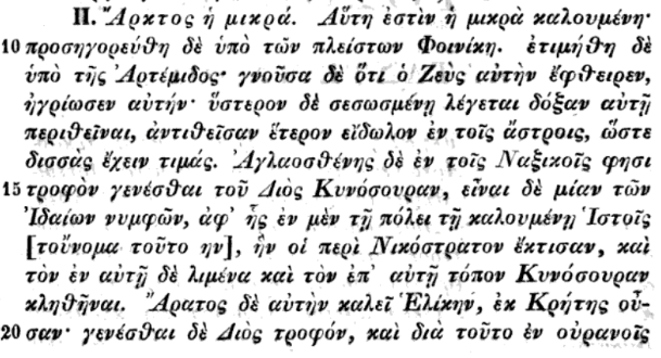 Ποικίλες είναι επίσης οι απόψεις για τον λόγο που η Μικρή Άρκτος αποκαλείται Φοινίκη (Phoenice), γιατί αυτοί που την χρησιμοποιούσαν ως πλοηγό τους λέγεται ότι έχαιραν μεγαλύτερης ακρίβειας και προστασίας και γιατί επίσης εφόσον ήταν πιο αξιόπιστη από την Μεγάλη Άρκτο δεν την ακολουθούσαν όλοι. Αυτοί οι άνθρωποι δε μοιάζουν να έχουν αντιληφθεί το λόγο που αποκαλούνταν Φοινίκη. Ο Θαλής ο Μιλήσιος, ο οποίος μελέτησε προσεκτικά αυτά τα θέματα και πρώτος απ᾽ όλους την ονομάτισε Άρκτο, είχε Φοινικική καταγωγή, όπως υποστηρίζει ο Ηρόδοτος. Ως εκ τούτου όλοι εκείνοι στην Πελοπόνησσο χρησιμοποίησαν την Άρκτο (που είχε περιγράψει ο Θαλής)· οι Φοίνικες ναυτικοί παρατηρούσαν ωστόσο το ίδιο άστρο (το οποίο είχε ανακαλυφθεί προγενέστερα του Θαλή) και θεωρούσαν ότι εφόσον το ακολουθούσαν πιστά θα τους κατηύθυνε με ακρίβεια, το ονομάτησαν δε, Φοινίκη, χάριν της καταγωγής του εξευρευνητή της.