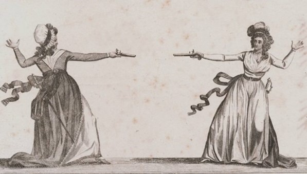 Η εν λόγω Γαλλική μονομαχία του 18ου αιώνα έγινε για την αγάπη ενός άνδρα, του δούκα του Ρισελιέ, όταν η κ. Νεσλέ, προκάλεσε την κ. Πολινιάκ σε μονομαχία. Η Πολινιάκ δέχτηκε και οι δύο ανέλαβαν τα όπλα, με δυο συνοδούς ως μάρτυρες. Αυτή την φορά, τα όπλα επιλογής ήσαν πιστόλια αντί ξιφών. Οι κανόνες της μονομαχίας ήσαν απλοί: μπορούσαν να προχωρήσουν τόσο μακριά όσο το μήκος ενός μαντηλιού και μπορούσαν να πυροβολήσουν οποιαδήποτε στιγμή. Η Νεσλέ ήταν η πρώτη που πυροβόλησε, αλλά αστόχησε. Η Πολινιάκ με τη σειρά της, κατάφερε να τραυματίσει τον ώμο της αντιπάλου της, αλλά δυστυχώς, παρά τις προσπάθειες, καμία γυναίκα δεν κέρδισε τον δούκα.
