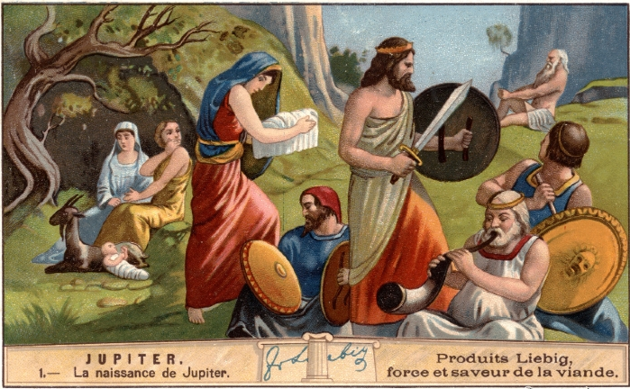 «Αφού η Ρέα γέννησε τον Δία, από τον Κρόνο, η Ήρα ζήτησε από την Ρέα να τον δώσει σε αυτήν, μετά την κατάληξη του Άδη στα Τάρταρα και του Ποσειδώνα στην θάλασσα, διότι ο Κρόνος ήξερε ότι ο γιος του θα του έπαιρνε το βασίλειο. Όταν ζήτησε το βρέφος για να το καταβροχθίσει, η Ρέα του έδειξε μια πέτρα τυλιγμένη σαν μωρό την οποία ο Κρόνος καταβρόχθισε. Όταν συνειδητοποίησε τι είχε κάνει, άρχισε να κυνηγά τον Δία σε όλη τη γη. Η Ρέα ωστόσο, πήρε τον Δία στο νησί της Κρήτης και η Αμάλθεια, νοσοκόμα του παιδιού, τον κρέμασε σε ένα λίκνο από ένα δέντρο, έτσι ώστε να μην μπορούσε να βρεθεί ούτε στον ουρανό ούτε στη γη ούτε μέσα στη θάλασσα. Και προκειμένου να μην ακούγεται το κλάμα του μωρού, αυτή κλήτευσε νέους και τους έδωσε μικρές χάλκινες ασπίδες και δόρατα και πρόσταξε να πάνε γύρω από το δέντρο κάνοντας θόρυβο. Στην Ελληνική γλώσσα αποκαλούνται Κουρήτες άλλοι τους αποκαλούν Κορύβαντες στην Ιταλία, ωστόσο ονομάζονται Λάρες»