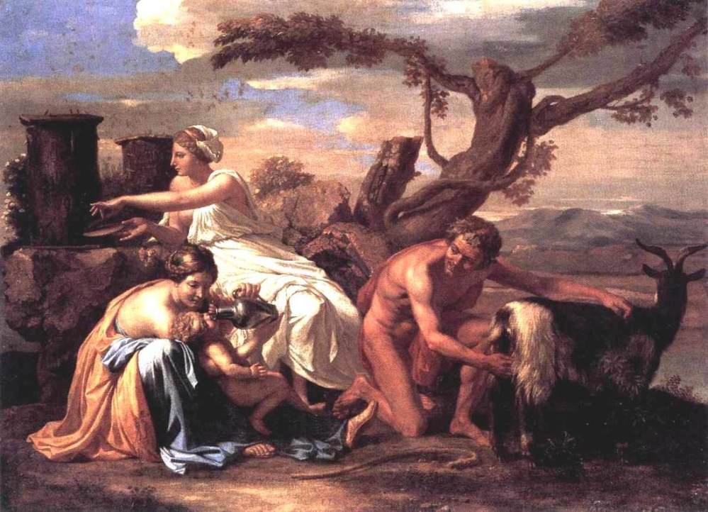 «Όταν η Ρέα γέννησε τον Δία, τον έκρυψε στην Ίδη εν αγνοία του Κρόνου και ανέθεσε την εκτροφή του στους Κουρήτες. Οι Κουρήτες τον έφεραν σε μια συγκεκριμένη σπηλιά όπου τον παρέδωσαν στις Νύμφες (Ίδη και Αδράστεια) με εντολή να υπηρετήσουν όλες τις ανάγκες του. Και οι Νύμφες βρεφοκόμησαν το νεογνό με μίγμα μελιού και γάλακτος και το θήλασαν στο μαστό της κατσίκας που ονομάστηκε Αμάλθεια.