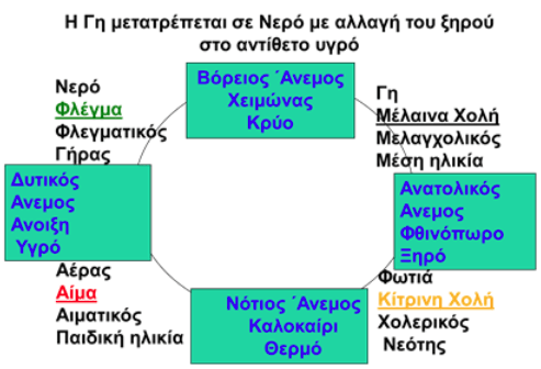 Το ανθρώπινο σώμα αποτελείται, όπως και όλο το σύμπαν, από γη, ύδωρ, αέρα και πυρ. Τα στοιχεία αυτά αντιπροσωπεύουν τις τέσσερις ιδιότητες του σώματος: ψυχρό, υγρό, ξηρό, θερμό. Για να διατηρηθεί η υγεία πρέπει αυτά τα τέσσερα θεμελιώδη στοιχεία να βρίσκονται, ανά δύο, σε ισορροπία, ήτοι θερμό με ψυχρό, ξηρό με υγρό. Αυτά τα στοιχεία αντιστοιχούν στους τέσσερις χυμούς του σώματος και έχουν τις ακόλουθες ιδιότητες: το νερό είναι υγρό και ψυχρό, ο αέρας είναι υγρός και θερμός, η φωτιά είναι ξηρή και θερμή, η γη είναι ξηρή και ψυχρή. Επίσης μεταβάλλονται κατά την διάρκεια των εποχών σύμφωνα με την αντιστοιχία: χειμώνας/νερό, άνοιξη/αέρας, καλοκαίρι/ φωτιά, φθινόπωρο/γη. Συνεπώς το νερό αυξάνεται τον χειμώνα, ο αέρας την άνοιξη, η φωτιά το καλοκαίρι και η γη το φθινόπωρο. Παράλληλα, υπάρχει μια αναλογία μεταξύ των τεσσάρων εποχών και των τεσσάρων ηλικιών του ανθρώπου: παιδική ηλικία/ άνοιξη, καλοκαίρι/ώριμη ηλικία, φθινόπωρο/τρίτη ηλικία, χειμώνας/γήρας.
