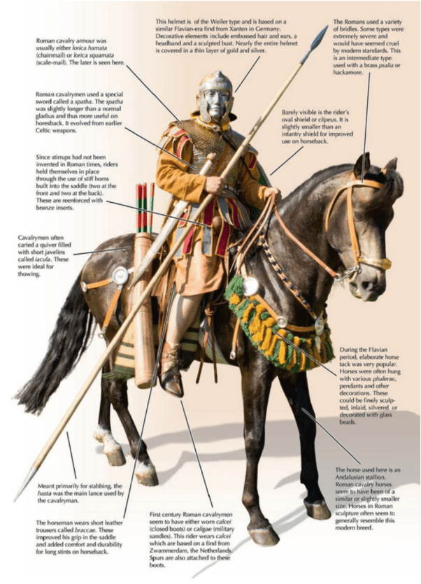 Το Ρωμαϊκό ιππικό, παρά την καταστροφική ήττα του Μάρκου Λικίνιου Κράσσου από τους έμπειρους Πάρθους ιππείς στην μάχη των Καρρών το 53 π.Χ., συνέχισε να διαδραματίζει σημαντικό ρόλο ως στρατιωτικό τμήμα επί Ιουλίου Καίσαρα κατά τους Γαλατικούς πολέμους. Ο Καίσαρας στρατολόγησε αναβάτες από όπου μπορούσε, ακόμα και από Γαλατικές φυλές και βελτίωσε τα όπλα υιοθετώντας λόγχες με αιχμές σε κάθε άκρο και μεγαλύτερες ασπίδες.