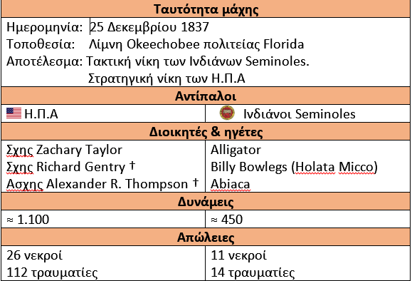 Ο στρατός του Taylor ο οποίος αποτελείτο από 70 Ινδιάνους Delaware, 180 εθελοντές πολιτοφύλακες από το Missouri και περίπου 800 Αμερικανούς στρατιώτες, αφίχθηκε την ημέρα των Χριστουγέννων του 1837, σε ένα μεγάλο πλάτωμα έχοντας μπροστά του μισό μίλι από βαλτώδες έδαφος. Στην απέναντι πλευρά βρισκόταν η λίμνη Okeechobee, όπου η βλάστηση είχε ύψος σχεδόν δύο μέτρα, ενώ η λάσπη και το νερό είχαν βάθος 3 μέτρα, συνθήκες απαγορευτικές για την χρήση ιππικού. Οι 450 Seminoles και οι σύμμαχοί τους επέλεξαν ως πεδίο σύγκρουσης την συγκεκριμένη τοποθεσία λόγω της γειτνίασης με τους καταυλισμούς και προς τούτο είχαν κόψει το χορτάρι για να έχουν ανοιχτό πεδίο σκόπευσης, ενώ χρησιμοποίησαν τα δέντρα ως μέσο στήριξης των μουσκέτων (πυροβόλα όπλα). Οι ανιχνευτές τους είχαν αναρριχηθεί στις κορυφές των δέντρων για να παρακολουθούν τις κινήσεις των Αμερικανών.