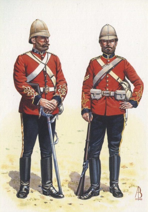 Το τακτικό Βρετανικό πεζικό ήταν εξοπλισμένο με τυφέκια Martini Henry και ξιφολόγχες και φορούσε κόκκινα χιτώνια, λευκά αντηλιακά κράνη και σκούρο μπλε παντελόνι με σιρίτι στο πλάι. Οι έφιππες μονάδες φορούσαν μπλε χιτώνια και καπέλα.