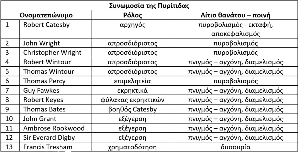 Στον παρακάτω πίνακα αναφέρονται οι βασικοί συνωμότες, ο ρόλος και η κατάληξή τους: