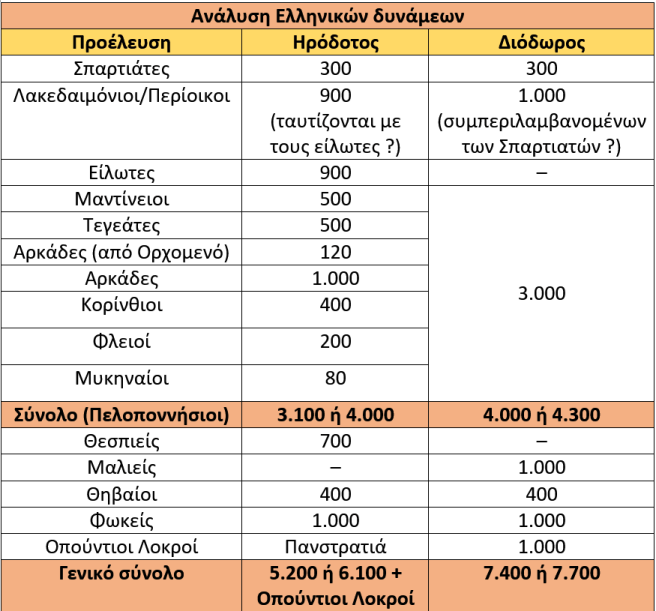 Σημ.1: Ο Διόδωρος αναφέρει ότι στις Θερμοπύλες πολέμησαν 1.000 Λακεδαιμόνιοι και 3.000 Πελοποννήσιοι (4.000 άνδρες) – ο Ηρόδοτος, ο οποίος παραπέμπει στον Σιμωνίδη τον Κείο, αναφέρει τον ίδιο αριθμό. Εντούτοις, ο Ηρόδοτος νωρίτερα είχε αναφερθεί στην παρουσία 3.100 Πελοποννησίων – αργότερα αναφέρεται και στους είλωτες και ο Reginald Walter Macan γράφει ότι «στις Θερμοπύλες βρίσκονταν και 900 είλωτες, 3 για κάθε Σπαρτιάτη». Οι είλωτες πιθανόν να συμμετείχαν στη μάχη ως ένοπλοι υπηρέτες των Σπαρτιατών, ειδάλλως αυτοί οι 900 άνδρες ήσαν οι περίοικοι, για τους οποίους κάνει λόγο ο Διόδωρος.