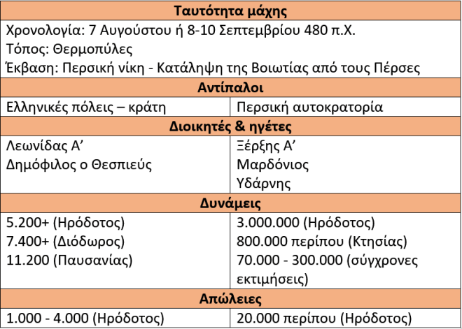 Η μάχη των Θερμοπυλών αποτελεί μια από τις γνωστότερες και σημαντικότερες μάχες στην Ιστορία. Οι Έλληνες αποφάσισαν να πολεμήσουν στις Θερμοπύλες και στο Αρτεμίσιο για να σταματήσουν την προώθηση των Περσών στη Βοιωτία και σύμφωνα με τον Tom Holland, «αν οι Έλληνες άντεχαν ακόμα μερικές μέρες, οι Πέρσες θα είχαν αναγκαστεί να υποχωρήσουν λόγω έλλειψης φαγητού και νερού». Η μάχη των Θερμοπυλών έληξε με νίκη των Περσών, αν και υπέστησαν περισσότερες απώλειες από τους Έλληνες.