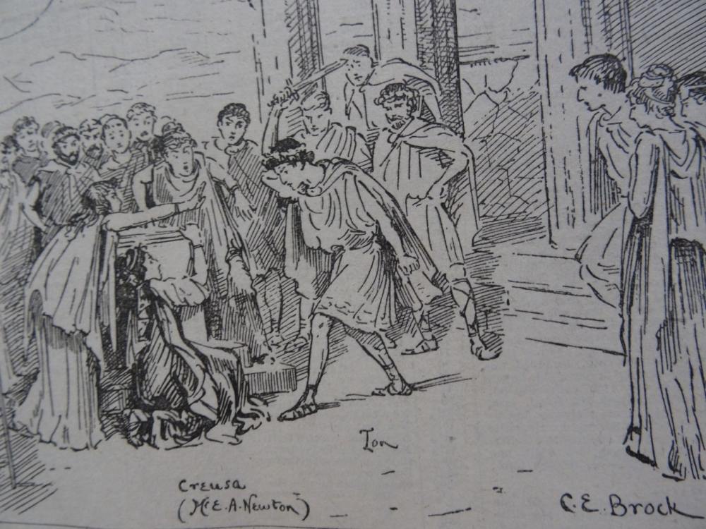 εξώφυλλο: Σκηνή από την τραγωδία του Ευρυπίδη «Ίων» απεικονίζονται η Αθηνά, η Κρέουσα και ο Ίων.