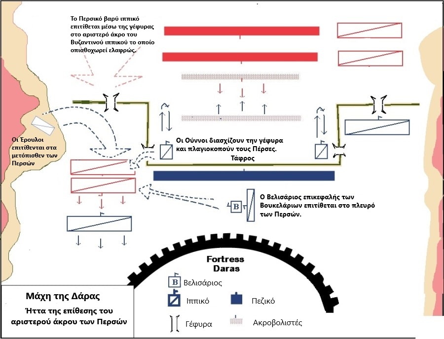 Κοντά στις πύλες της Δάρας, η αριστερή πλευρά των Περσών βρίσκεται αποκομμένη από το πεζικό τους. Ο Βελισάριος βλέποντας το χάσμα μετακινεί τους 1.200 Ούννους ιππείς από το κέντρο και τους εξαπολύει στα μετόπισθεν της Περσικής αριστερής πτέρυγας, ενώ ταυτόχρονα στέλνει τους επίλεκτους της προσωπικής του φρουράς ενάντια στο Περσικό ιππικό. Δεχόμενοι επίθεση από τρεις πλευρές, οι Αθάνατοι διασπώνται και εγκαταλείπουν το πεδίο μάχης.