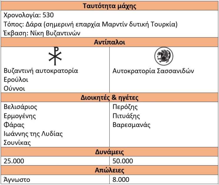 Σημείωση ιστολογίου: Οι Βυζαντινοί επιδίδονταν σε μακροχρόνιους, σκληρούς και ενίοτε άσκοπους συνοριακούς πολέμους με τους Πέρσες. Υστερώντας αριθμητικά έναντι των Περσών σε αναλογία 2 προς 1, ο στρατηγός Βελισάριος δεν επεδίωξε μάχη στο ανοιχτό πεδίο της ερήμου όπου μπορούσε να υποστεί ολοκληρωτική ήττα. Οι Βυζαντινοί ενίσχυσαν τις θέσεις τους με οχυρωματικά έργα, έχοντας στην «πλάτη» τους τα τείχη του οχυρού της Δάρας, εξασφαλίζοντας τοιουτοτρόπως προστασία, τρόφιμα και νερό στην ανοιχτή και στεγνή έρημο της Μεσοποταμίας.