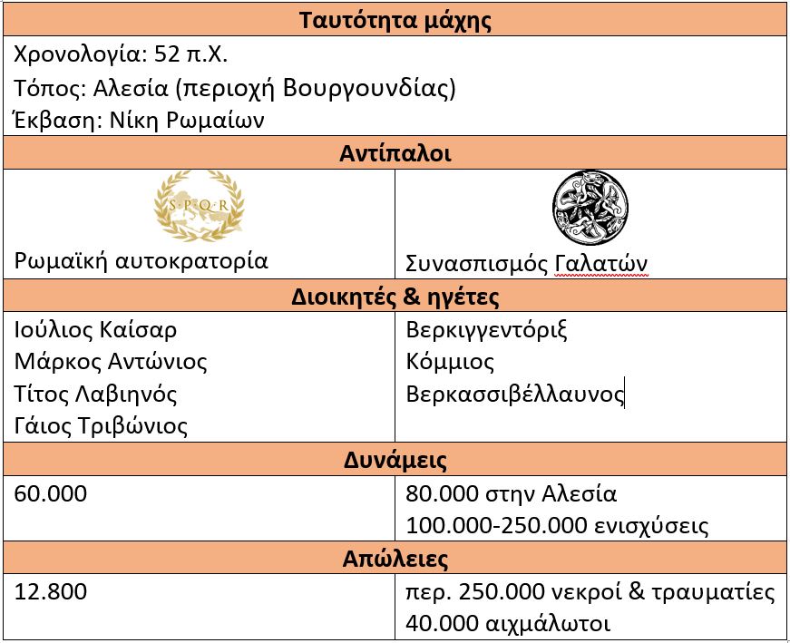 Η μάχη της Αλεσίας διεξήχθη κατά τη διάρκεια των Γαλατικών Πολέμων (58-51 π.Χ.) το χρονικό διάστημα Σεπτεμβρίου – Οκτωβρίου 52 π.Χ. μεταξύ Ιουλίου Καίσαρα και Βερκιγγεντόριξ/Vercingetorix και έληξε με ήττα του δεύτερου και των συνασπισμένων Γαλατών (Κέλτες). Η τοποθεσία εντοπίζεται στην περιοχή της σημερινής κοινότητας Αλίζ Σαιντ Ρεν, στο νομό Κοτ ντ’ Ορ, της Βουργουνδίας, όπου ο Ιούλιος Καίσαρ πολιόρκησε τους Γαλάτες στον οικισμό της Αλεσίας. Κατά τη διάρκεια της πολιορκίας, ο Καίσαρας νίκησε τις ενισχύσεις των Γαλατών, υπό την ηγεσία των Κόμμιου/Commius και Βερκασσιβέλαυνου/Vercassivellaunus, ενώ εμπόδισε τον Βερκιγγεντόριξ να διαφύγει. Παγιδευμένος, ο Γαλάτης ηγέτης παραδόθηκε εκχωρώντας ουσιαστικά τον έλεγχο της Γαλατίας στη Ρώμη.
