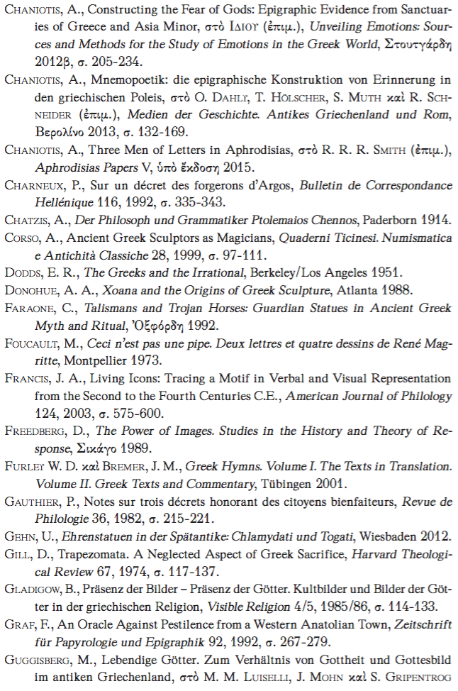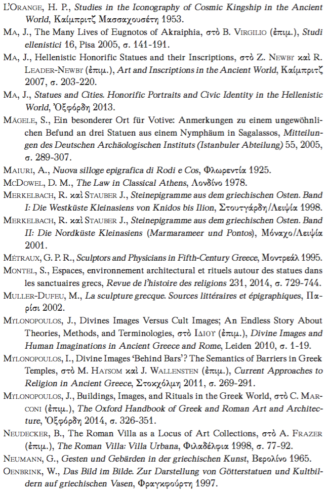 Οἱ μαρτυρίες στὶς ἀρχαῖες γραμματειακὲς πηγές, τὶς ἐπιγραφὲς καὶ τοὺς παπύρους ἀναδεικνύουν τὰ ἀγάλματα ἀπὸ τὴν ἐποχὴ τοῦ Ὁμήρου ἕως τὴν ἐπικράτηση τοῦ Χριστιανισμοῦ ὡς μνημεῖα πρωταρχικῆς σημασίας ὄχι μόνο γιὰ τὴ διαμόρφωση ταυτότητας καὶ τὴν προαγωγὴ τοῦ κύρους εὐεργετῶν, πολιτικῶν καὶ μοναρχῶν, ἀλλὰ καὶ γιὰ τὴ διέγερση τοῦ συναισθήματος καὶ τὴ μεταβίβαση τῆς μνήμης, θέματα στὰ ὁποῖα ἀκροθιγῶς ἀναφέρθηκα στὴν ὁμιλία μου. Στοὺς δημόσιους καὶ ἱεροὺς χώρους τῆς ἀρχαίας πόλης τὰ ἀγάλματα ἦταν ἀντικείμενο μιᾶς ἰδιαίτερα δυναμικῆς σχέσης μὲ τοὺς θεατὲς καί, στὴν περίπτωση τῆς θρησκείας, τοὺς λάτρεις καὶ τοὺς «χρῆστες» τους. Ἀπόρροια αὐτῆς τῆς δυναμικῆς σχέσης ἦταν κάτω ἀπὸ ἰδιαίτερες συνθῆκες τὰ ἀγάλματα νὰ ἀντιμετωπίζονται ὡς ζωντανὰ σώματα, νὰ θεωροῦνται ὡς φορεῖς ἐπιφάνειας καὶ δράστες ἐνεργειῶν, ἀλλὰ καὶ νὰ ἔχουν βίους μὲ δραματικὲς ἐναλλαγές.