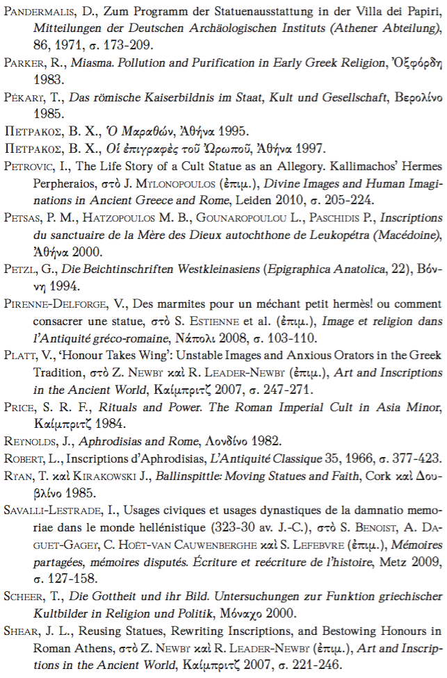 Κομμάτι τῆς ζωῆς ἑνὸς ἀνδριάντα ἦταν καὶ ἡ ἐπαναχρησιμοποίησή του γιὰ νὰ τιμήσει ἕνα ἐντελῶς διαφορετικὸ πρόσωπο [Αὐτὸ εἶναι τὸ ἀντικείμενο τοῦ Ροδιακοῦ λόγου τοῦ Δίωνος Χρυσοστόμου (31). Σχετικὰ βλ. Jones 1978, σ. 26-34· Platt 2007. Γενικὰ γιὰ τὸ φαινόμενο τῆς ἐπαναχρησιμοποίησης ἀγαλμάτων βλ. Blanck 1969]. Γιὰ παράδειγμα στὴν Κῶ τοῦ 1ου μ.Χ. αἰώνα μιὰ ἀνώνυμη ποιήτρια τιμήθηκε μὲ τὴν ἀνάθεση ἀνδριάντα ποὺ δὲν εἰκόνιζε τὴν ἴδια, ἀλλὰ τὴν κατὰ δύο καὶ πλέον αἰῶνες ἀρχαιότερη ποιήτρια Δελφίδα: ἁ εἰκὼν Δελφίδος τᾶς Πραξαγόρα Κώιας ἐλεγειογράφου ἔγραφε ἡ τιμητικὴ ἐπιγραφή [SEG LIV 787· IG XII.4.845. Κατ ̓ ἀνάλογο τρόπο ὁ ρήτορας Πολύβιος στὶς Σάρδεις ἔστησε πορτραῖτο τοῦ Κικέρωνα, συσχετίζοντας τὴ δική του ρητορικὴ δεινότητα μὲ ἐκείνη τοῦ Ῥωμαϊκῶν προκρίτου]. Προφανῶς μὲ τὸν τρόπο αὐτὸ οἱ ἰδιότητες τῆς διάσημης τοπικῆς ποιήτριας ἀποδόθηκαν στὴ νεώτερη ὁμότεχνό της. Ἕνα ἀνάλογο φαινόμενο συναντᾶμε στὴν Ἀθήνα τῶν ὕστερων ἑλληνιστικῶν καὶ ρωμαϊκῶν χρόνων, ὅταν γιὰ νὰ τιμηθοῦν ρωμαῖοι ἀξιωματοῦχοι χρησιμοποιοῦνταν συνειδητὰ βάσεις ἀγαλμάτων ποὺ εἶχαν φιλοτεχνηθεῖ ἀπὸ διάσημους γλύπτες ἢ ἀπεικόνιζαν φημισμένα πρόσωπα [Shear 2007· Keesling 2010]. Πίσω ἀπὸ αὐτὰ τὰ φαινόμενα βρίσκεται ἡ ἴδια νοοτροπία ποὺ ὁδηγοῦσε τοὺς δημιουργοὺς ἐπιτύμβιων μνημείων στὴ Μακεδονία τῶν αὐτοκρατορικῶν χρόνων νὰ μὴν τὰ κοσμοῦν μὲ ἀνάγλυφες παραστάσεις τῶν νεκρῶν ἀλλὰ μὲ παραστάσεις θεῶν, κυρίως τῆς Ἀφροδίτης [Π.χ. I.Beroia 214, 244, 284, 354, 508].