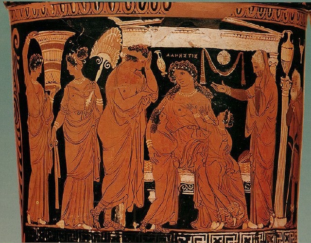Αν και περισσότερο διαδεδομένος είναι ο έρωτας του Άδμητου για την Άλκηστη, εντούτοις η δεύτερη είναι γνωστή για την αφοσίωση στον σύζυγό της, αφού πήρε τη θέση του στο θάνατο και επέστρεψε στη ζωή κατόπιν παρέμβασης του Ηρακλέους. Υπάρχουν δύο εκδοχές της ιστορίας, μία από τη Βιβλιοθήκη του Ψευδο-Απολλόδωρου (1ο-2ο αιώνα μ.Χ.) όπου ο Ηρακλής δεν διαδραματίζει κάποιο ρόλο, αλλά χάρις στον Ευριπίδη (480-406 π.Χ.) και το έργο του Άλκηστις (γραμμένο 438 π.Χ.) η εκδοχή με τη συμμετοχή του Ηρακλή είναι η πιο γνωστή.