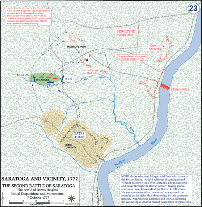 Στο Αμερικανικό στρατόπεδο, η κατάσταση μεταξύ των διοικητών έφτασε σε οριακό σημείο όταν ο Γκέιτς δεν συμπεριέλαβε τον Άρνολντ στην έκθεσή του στο Κογκρέσο σχετικά με τη μάχη του Φρίμαν. Εξοργισμένος ο Γκέιτς απήλλαξε τον Άρνολντ και ανέθεσε την διοίκηση στον στρατηγό Μπέντζαμιν Λίνκολν/Benjamin Lincoln. Παρότι μετατέθηκε στον στρατό του Ουάσιγκτον, ο Άρνολντ παρέμεινε καθώς όλο και περισσότεροι άνδρες έφταναν στο στρατόπεδο.