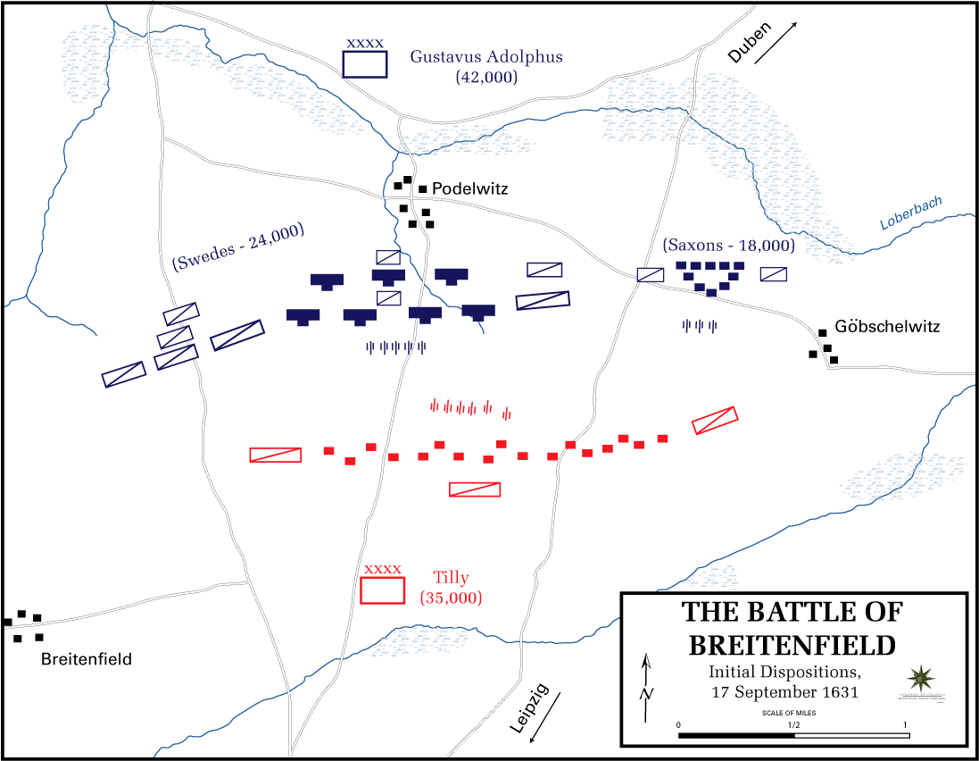 Ο Γουσταύος Αδόλφος αντιμετώπισε τον Τσέρκλας στο Μπράιτενφελντ/Breitenfeld, περίπου πέντε μίλια βόρεια της Λειψίας. Ο Τσέρκλας παρέταξε τους 35.000 άνδρες του σε κορυφογραμμή με τυπικό σχηματισμό τοποθετώντας στην κορυφή το βαρύ πυροβολικό. Ο Γουσταύος παρατάχθηκε απέναντί του με τις μικρότερες, πιο ευκίνητες ταξιαρχίες του.