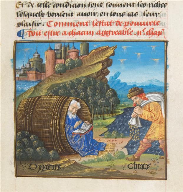 Το όραμα του Αρίστιππου αμφισβητήθηκε από τις σχολές που ίδρυσαν οι άλλοι μαθητές του Σωκράτη, αλλά κυρίως από την Κυνική Σχολή που ίδρυσε ο Αντισθένης, ο οποίος υποστήριζε την απλή ζωή χωρίς πολυτέλειες. Οι Κυνικοί ονομάζονταν έτσι επειδή οι άνθρωποι θεωρούσαν ότι ζούσαν σαν σκύλοι (αρχ. κύων) που επεδίωκαν το συμφέρον τους, όρος ο οποίος σήμερα χαρακτηρίζει κάποιον που είναι δύσπιστος προερχόμενος από την σχολή που αμφισβητούσε όλες τις κοινωνικές συμβάσεις. Ο Αντισθένης δίδασκε ένα ακραίο δόγμα λιτότητας μέσω του οποίου μπορούσε κάποιος να είναι ελεύθερος αποκηρύσσοντας όλες τις παγίδες της κοινωνίας και της συμβατικής αξίας, συμπεριλαμβανομένης της ιδιοκτησίας και της θέσης του, ζώντας χωρίς καμία υποχρέωση προς κανέναν.