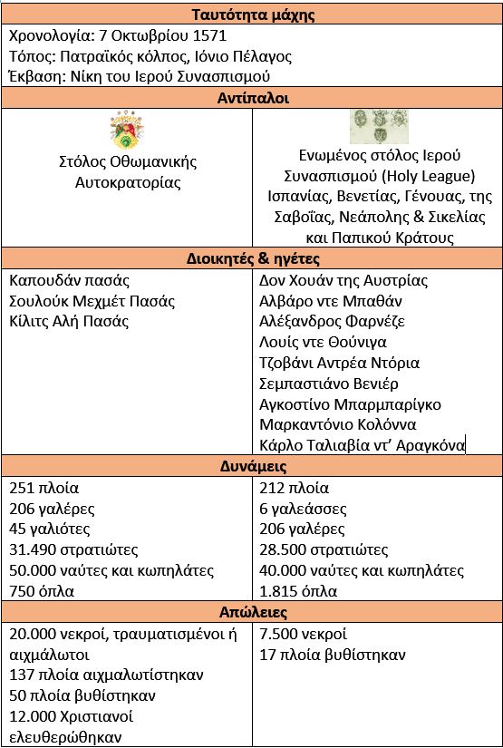 Ο στόλος της Χριστιανικής συμμαχίας επανδρώθηκε από 12.920 ναυτικούς. Επιπλέον, μετέφερε σχεδόν 28.000 στρατιώτες ως εξής: 10.000 επίλεκτους Ισπανούς, 7.000 Γερμανούς, 6.000 Ιταλούς μισθοφόρους και 5.000 επίλεκτους Ενετούς στρατιώτες. Επίσης, οι Ενετοί κωπηλάτες ήταν κυρίως ελεύθεροι πολίτες και ήταν σε θέση να φέρουν όπλα συνεισφέροντας στην πολεμική δύναμη του πλοίου τους, ενώ σκλάβοι και κατάδικοι χρησιμοποιήθηκαν για να κωπηλατήσουν γαλέρες σε άλλες μοίρες του Ιερού Συνασπισμού. Σε αρκετές από τις γαλέρες του Τουρκικού στόλου κωπηλατούσαν σκλάβοι, κυρίως Χριστιανοί που είχαν αιχμαλωτιστεί σε προηγούμενες κατακτήσεις και μάχες. Οι ελεύθεροι κωπηλάτες ήταν ανώτεροι από όλους τους μαχητές, αλλά αντικαταστάθηκαν σταδιακά σε όλους τους στόλους (συμπεριλαμβανομένων εκείνων της Βενετίας από το 1549) κατά τη διάρκεια του 16ου αιώνα από φθηνότερους σκλάβους, κατάδικους και αιχμαλώτους πολέμου λόγω του ταχέως αυξανόμενου κόστους.