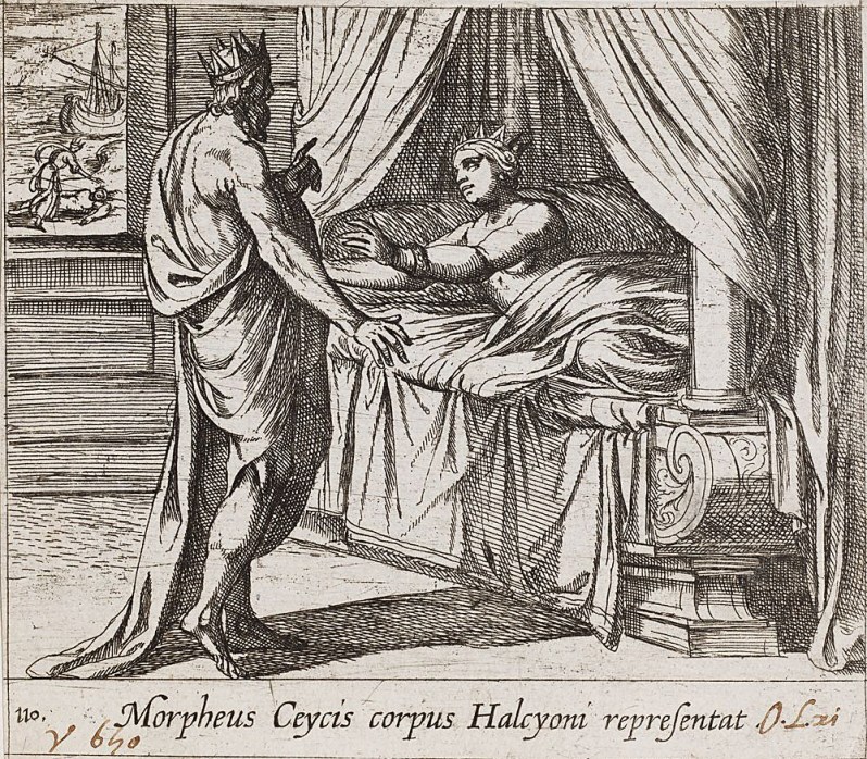 Η Αλκυόνη έπεσε τρέμοντας, κλαίγοντας, αγκαλιάζοντας τον σύζυγό της με ανείπωτη θλίψη, και αφού είπε ένα ύστατο αντίο…….ξεψύχησε. Οβίδιος Μεταμορφώσεις 11.458