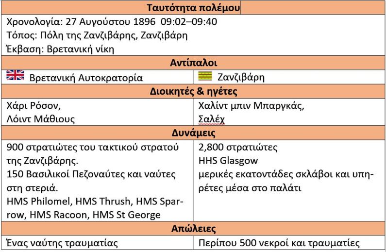 Η σύγκρουση μεταξύ Βρετανικής αυτοκρατορίας και Σουλτανάτου της Ζανζιβάρης, η οποία έλαβε χώρα στις 27 Αυγούστου 1896 θεωρείται ο συντομότερος πόλεμος της ιστορίας, αφού διήρκεσε μόλις 38 λεπτά.