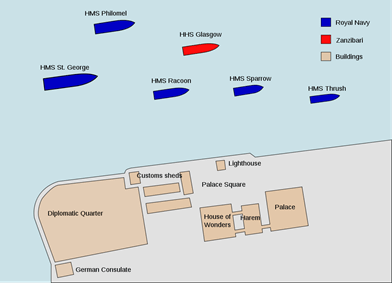 Η Ζανζιβάρη είναι νησιωτική χώρα στον Ινδικό Ωκεανό, κοντά στην ακτή της πρώην Τανγκανίκας, που σήμερα αποτελεί τμήμα της Τανζανίας. Το νησί από το 1698 βρίσκονταν υπό τον έλεγχο του Σουλτάνου του Ομάν όταν έδιωξε τους Πορτογάλους αποίκους οι οποίοι το διεκδικούσαν από το 1499. Ο Σουλτάνος Ματζίντ μπιν Σαΐντ το 1858 ανακήρυξε το νησί ανεξάρτητο από το Ομάν, κίνηση που αναγνωρίστηκε από την Μεγάλη Βρετανία. Οι επόμενοι Σουλτάνοι εγκατέστησαν την πρωτεύουσα και την έδρα της κυβέρνησής τους στην Πόλη της Ζανζιβάρης όπου χτίστηκε και το σύμπλεγμα του παλατιού στην ακτή της. Το 1896 το σύμπλεγμα αποτελείτο από το παλάτι, το χαρέμι Μπεΐτ αλ Χούκμ και το Μπεΐτ αλ Χατζαΐμπ ή «Σπίτι των Θαυμάτων»—ένα επίσημο οίκημα που λέγεται ότι ήταν το πρώτο κτήριο στην Ανατολική Αφρική που ηλεκτροδοτήθηκε. Το σύμπλεγμα κατασκευάστηκε κατά κύριο λόγο από τοπική ξυλεία, δεν διέθετε κάποιου είδους οχύρωση και τα τρία κύρια κτίσματα ήταν το ένα δίπλα στο άλλο σε ευθεία και συνδέονταν με ξύλινες σκεπαστές γέφυρες.