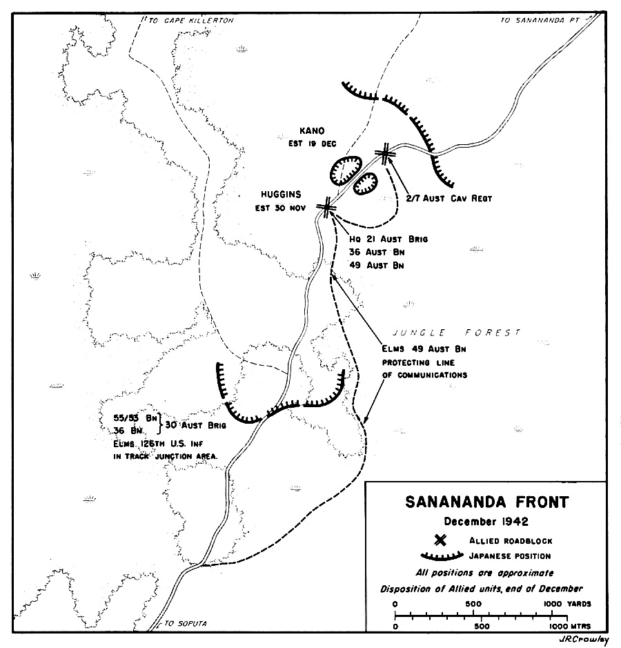 Η Αυστραλιανή 16η Ταξιαρχία κατευθύνθηκε προς τη Σανανάντα, αλλά στις 19 Νοεμβρίου, συνάντησαν Ιαπωνικό φυλάκιο αποστολή του οποίου ήταν να καθυστερήσει μια προωθούμενη δύναμη, για να δώσει χρόνο στους Ιάπωνες να ολοκληρώσουν τις αμυντικές προετοιμασίες στη Σανανάντα. Οι Αυστραλοί επιτέθηκαν καταφέρνοντας να εξουδετερώσουν το φυλάκιο και να συνεχίσουν την προέλασή τους αλλά μέχρι το μεσημέρι σταμάτησαν. Η 16η Ταξιαρχία παρά τις σοβαρές απώλειες από μάχες και ασθένειες, παρέμενε ακόμα μάχιμη, αλλά οι άνδρες της ήταν κουρασμένοι και δεν μπορούσαν να συνεχίσουν τις επιθέσεις. Ο Μακ Άρθουρ αποφάσισε να αποσπάσει το 26ο Σύνταγμα από την 32η Μεραρχία στους Αυστραλούς παρά το γεγονός ότι ο Χάρντινγκ τους είχε αναθέσει να καταλάβουν το χωριό Μπούνα. Ο στρατηγός Χάρντινγκ δεν μπορούσε να κατανοήσει την απόσπαση της μισής δύναμής του στους Αυστραλούς, τη στιγμή που επρόκειτο να την χρησιμοποιήσει για να καταλάβει το Μπούνα. Θεωρούσε ότι αυτή η κίνηση θα οδηγούσε σε σύγχυση, δυσαρέσκεια και απογοήτευση, αλλά ο Μακ Άρθουρ, ο οποίος είχε λανθασμένη εικόνα για την Ιαπωνική δύναμη στο Μπούνα, εκτιμούσε ότι ο Χάρντινγκ μπορούσε να ολοκληρώσει την αποστολή του με ένα σύνταγμα.