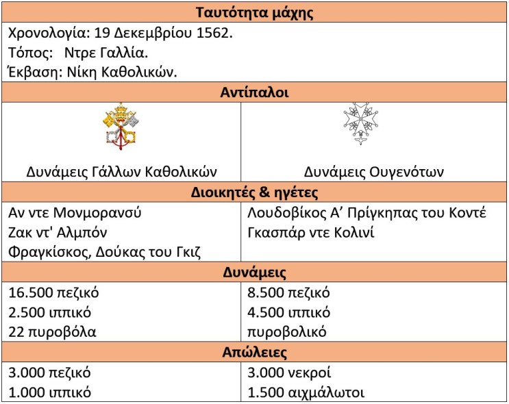 Η μάχη της Ντρε, ήταν η μόνη μεγάλη σύρραξη κατά την οποία μάλιστα, αμφότεροι οι αντίπαλοι στρατηγοί αιχμαλωτίστηκαν. Ο στρατός των Καθολικών, υπό την διοίκηση των Φραγκίσκου του Γκιζ και Αν ντε Μονμορανσύ, επικράτησε των Προτεσταντών, τους οποίους διοικούσε ο Λουδοβίκος Α΄ Πρίγκηπας του Κοντέ, μετά από σκληρή μάχη.