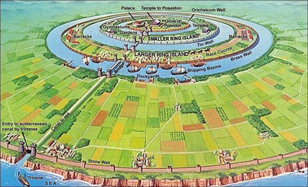 Αναπαράσταση της πρωτεύουσας της Ατλαντίδας απεικονίζει την κοινή πεποίθηση ότι πέρα από τους τρεις τοίχους της πρωτεύουσας με πολλούς δακτυλίους υπήρχε ένα τέταρτο κυκλικό τείχος που βρισκόταν 50 στάδια (9,2 χλμ.) πέρα από τον εξωτερικό δακτύλιο. Η είσοδος μέσω αυτού του τοίχου φαίνεται στην κάτω αριστερή γωνία.