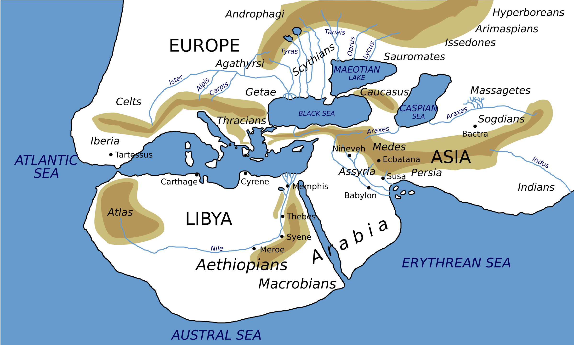 Αναπαράσταση της Οικουμένης (κατοικημένος κόσμος) ένας αρχαίος χάρτης βασισμένος στην περιγραφή του κόσμου από τον Ηρόδοτο, περίπου το 450 π.Χ. Bibi Saint-Pol,Public domain, via Wikimedia Commons
